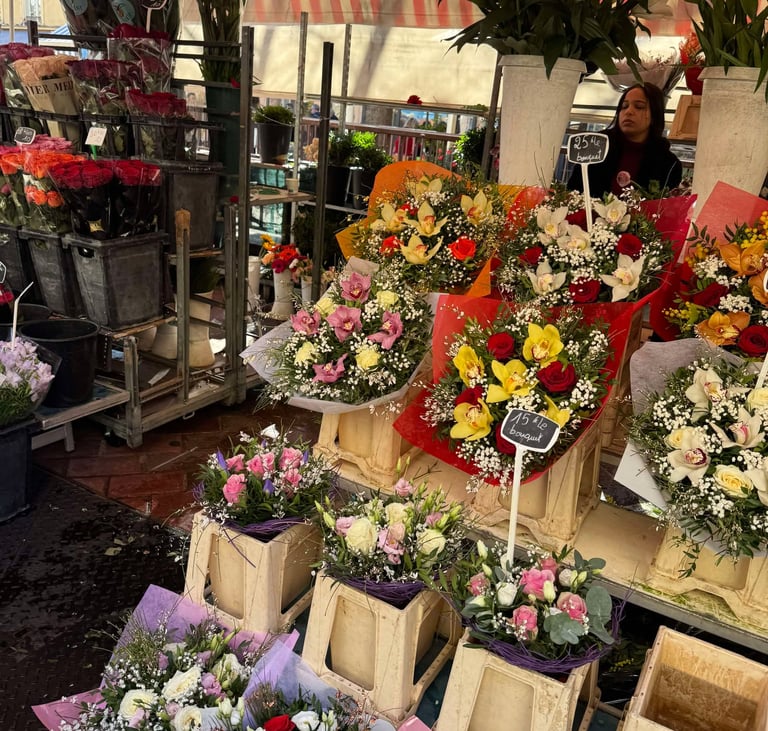 Le marché aux fleurs du cours Saleya à Nice est un véritable enchantement pour les sens. Chaque matin, cet espace vibrant s'anime avec des étals colorés où se mêlent les parfums envoûtants des fleurs locales et exotiques. Les fleurs fraîches, des roses éclatantes aux pivoines délicates, s’entassent en bouquets magnifiques, attirant les passants.